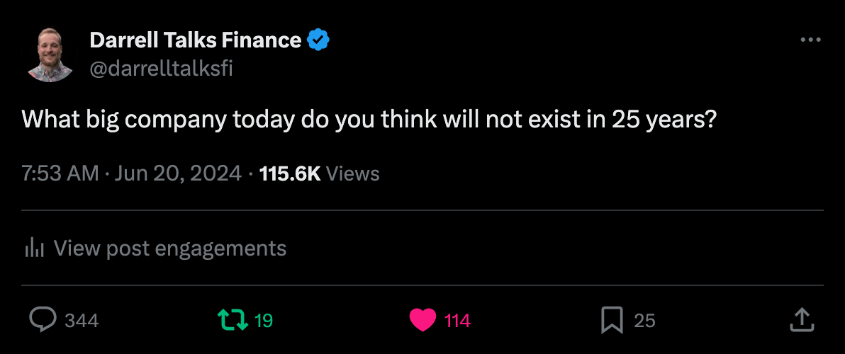 “What big company today do you think will not exist in 25 years?”