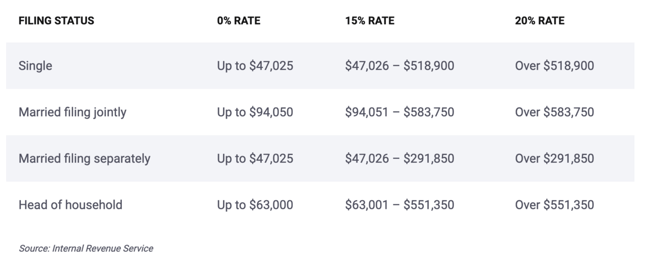 Long-term gains are subject to tax rates of 0%, 15%, or 20%, with 20% being the highest